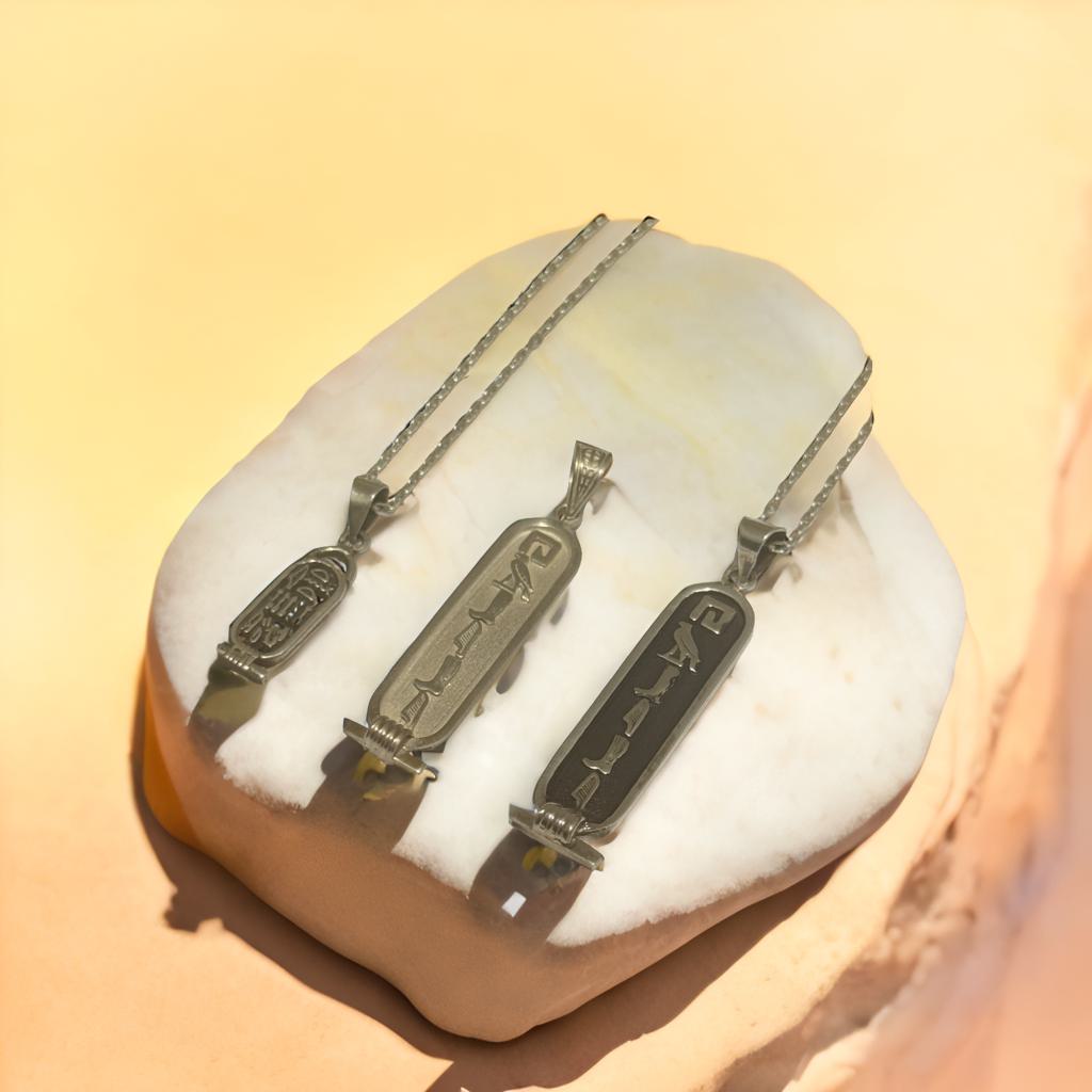 Shop nowCartouche comes from the French language, meaning cartridge—a shape resembling the oval frame of Egyptian hieroglyphic inscriptions. French scholars, in the 18th century, coined the term after noticing this similarity. The cartouche was used in ancient Egypt to protect the names of royalty, ensuring that their names would live on forever. It’s a symbol of immortality, protection, and strength.
