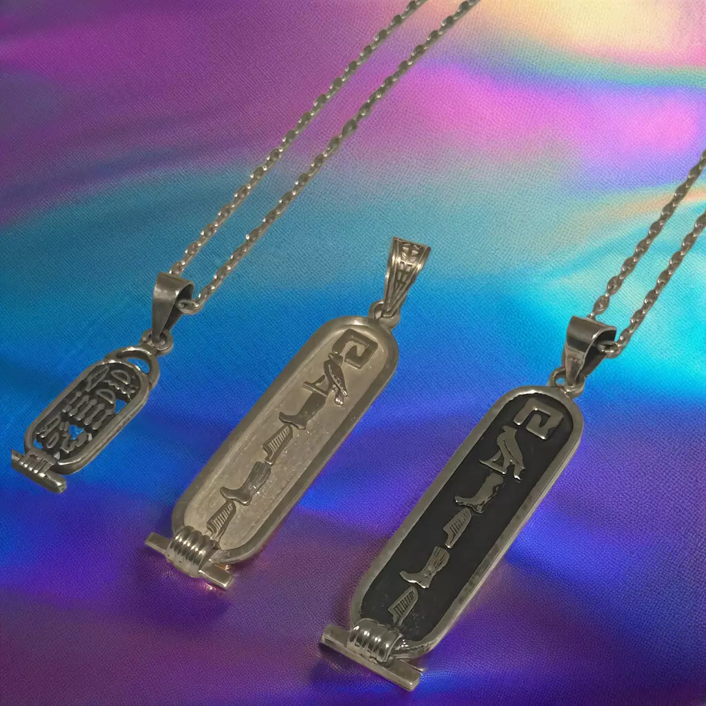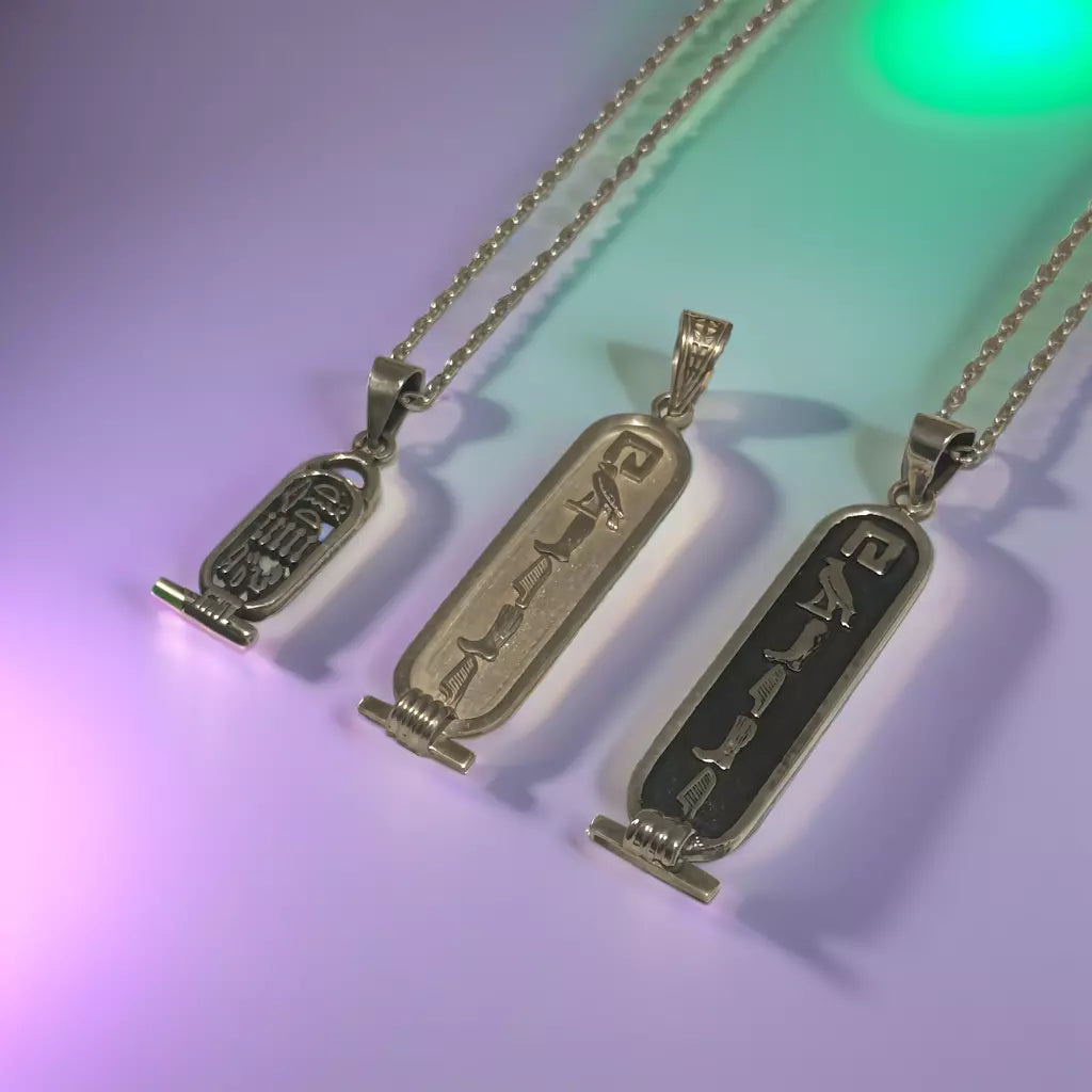 Shop nowCartouche comes from the French language, meaning cartridge—a shape resembling the oval frame of Egyptian hieroglyphic inscriptions. French scholars, in the 18th century, coined the term after noticing this similarity. The cartouche was used in ancient Egypt to protect the names of royalty, ensuring that their names would live on forever. It’s a symbol of immortality, protection, and strength.